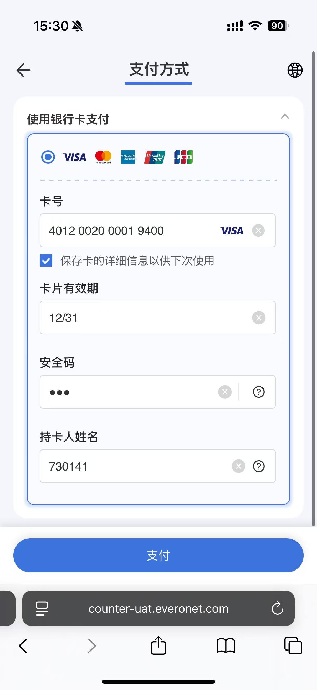 - When you enter the transaction page again, you can directly use the previously saved card for payment.